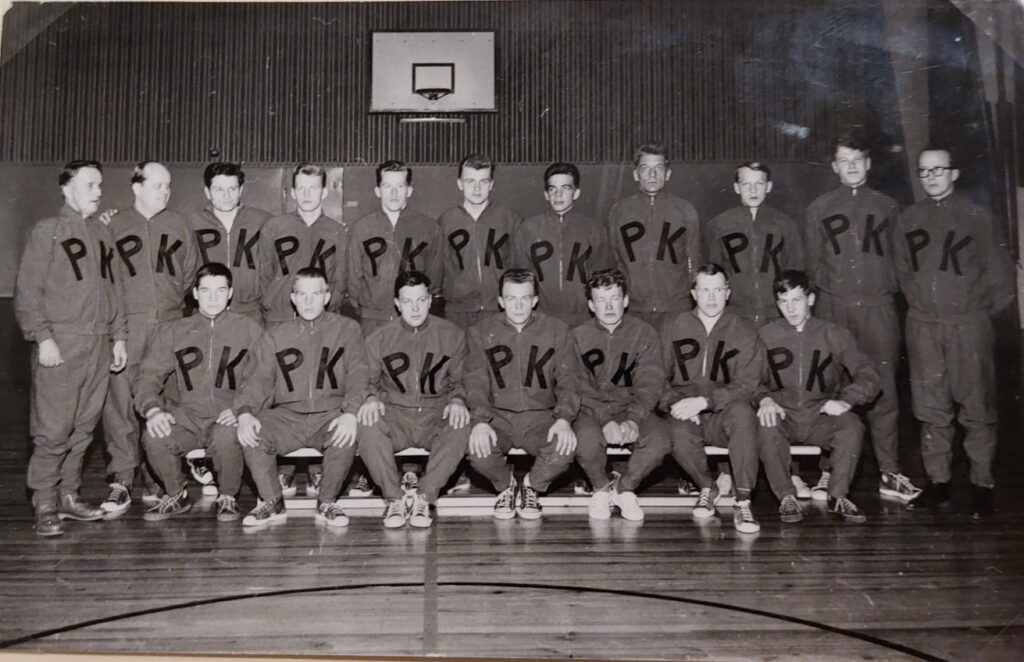 Tässä on Pallokissojen edustusjoukkue ryhmäkuvassa Mikkelin Urheilutalolla 1960-luvun alkupuolella. Kuva on Juhani Pöyryn albumista ja Kissojen omasta arkistosta peräisin.