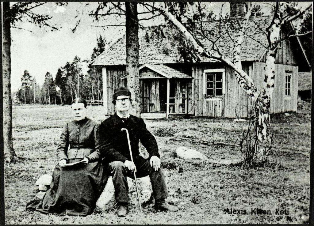 Tämä kuva on julkaistu kirjassa Vuosisatamme kuvissa. Tässä on Albert Stenvall yhdessä toisen vaimonsa Vilhelmiinan kanssa kotitorppansa edustalla.