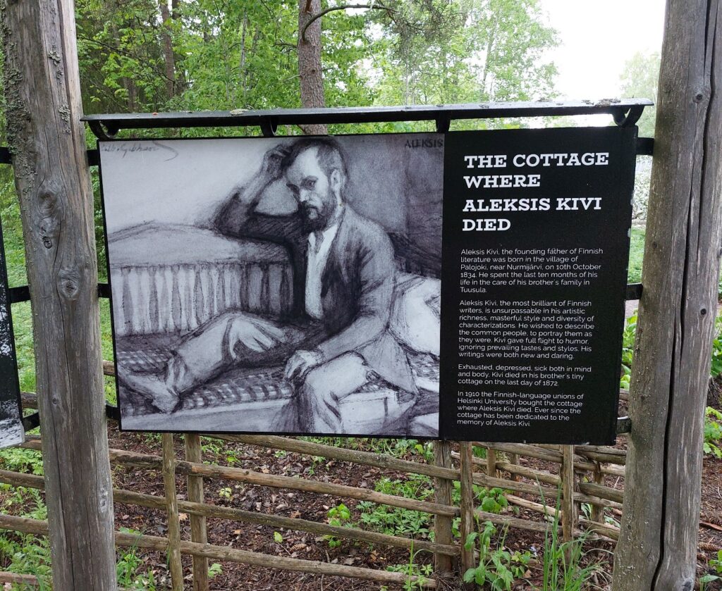Olen itse ottanut oheisen kuvan. Siinä on infotaulu, jossa kerrotaan englannin kielellä perustietoja Aleksis Kivestä. Hän syntyi Palojoella lähellä Nurmijärveä 10.10.1934.