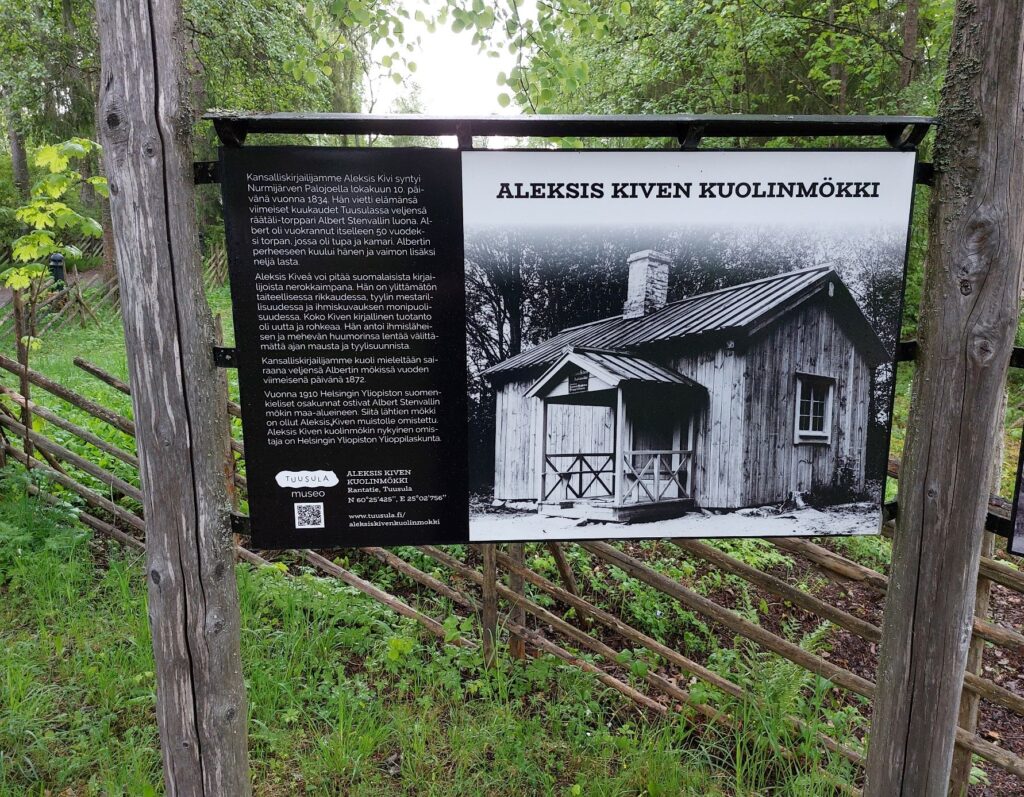 Olen tämän kuvan ottanut käynnilläni 25.5.2024. Oheisessa info-taulussa kerrotaan muun muassa, että Albertilla oli vaimonsa lisäksi neljä lasta. Torppa käsitti tuvan ja kamarin. Vuonna 1910 Helsingin yliopiston suomenkieliset osakunnat ostivat Albert Stenvallin mökin maa-alueineen. Siitä lähtien se on ollut Aleksis Kiven muistolle omistettu. Nykyinen omistaja on Helsingin yliopiston ylioppilaskunta.