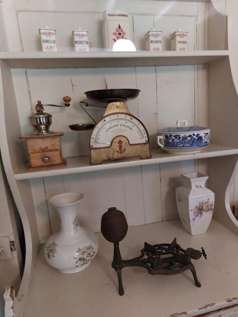 Monenlaista keittiössä tarvittavaa apuvälinettä löytyy avohyllystä. Siinä on muun muassa kahvimylly ja talousvaaka.