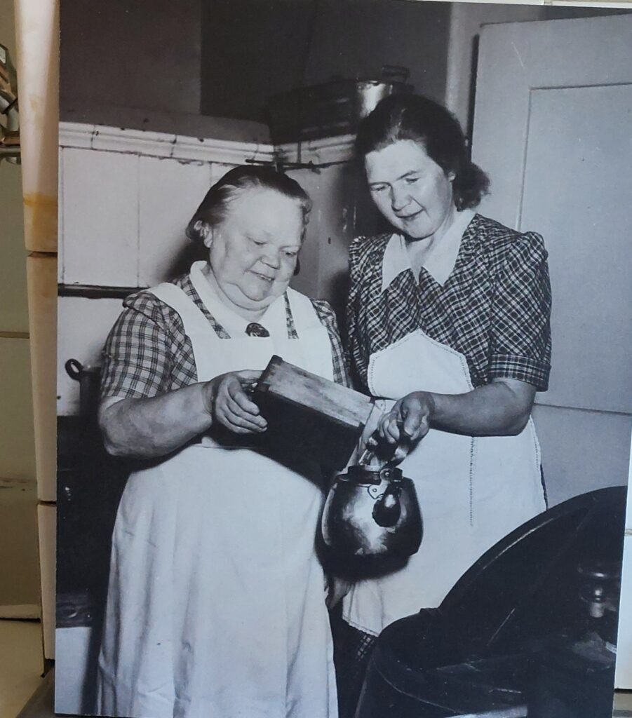 Otin oheisen kuvan kuvasta, joka oli heidän huoneensa seinällä käydessäni Ainolassa 20.5.2022. Tämä parivaljakko työskenteli Sibeliuksen perheessä liki 60 vuotta. Aino Sibelius itse vastasi aterioiden suunnittelusta ja tavaroiden tilauksista. Perheen rutiini oli sellainen, että kahvi juotiin aamulla yhdeksän aikoihin. Klo 10 Janne ja Aino lähtivät kävelylle. Puolen päivän aikaan syötiin aamiainen. Päiväkahvi juotiin 14-15 välillä. Melkoisen reilu päivällinen syötiin 17-18 aikaan. Ruokailutottumuksista on myöhemmin kertonut Helmi Vainikainen.
