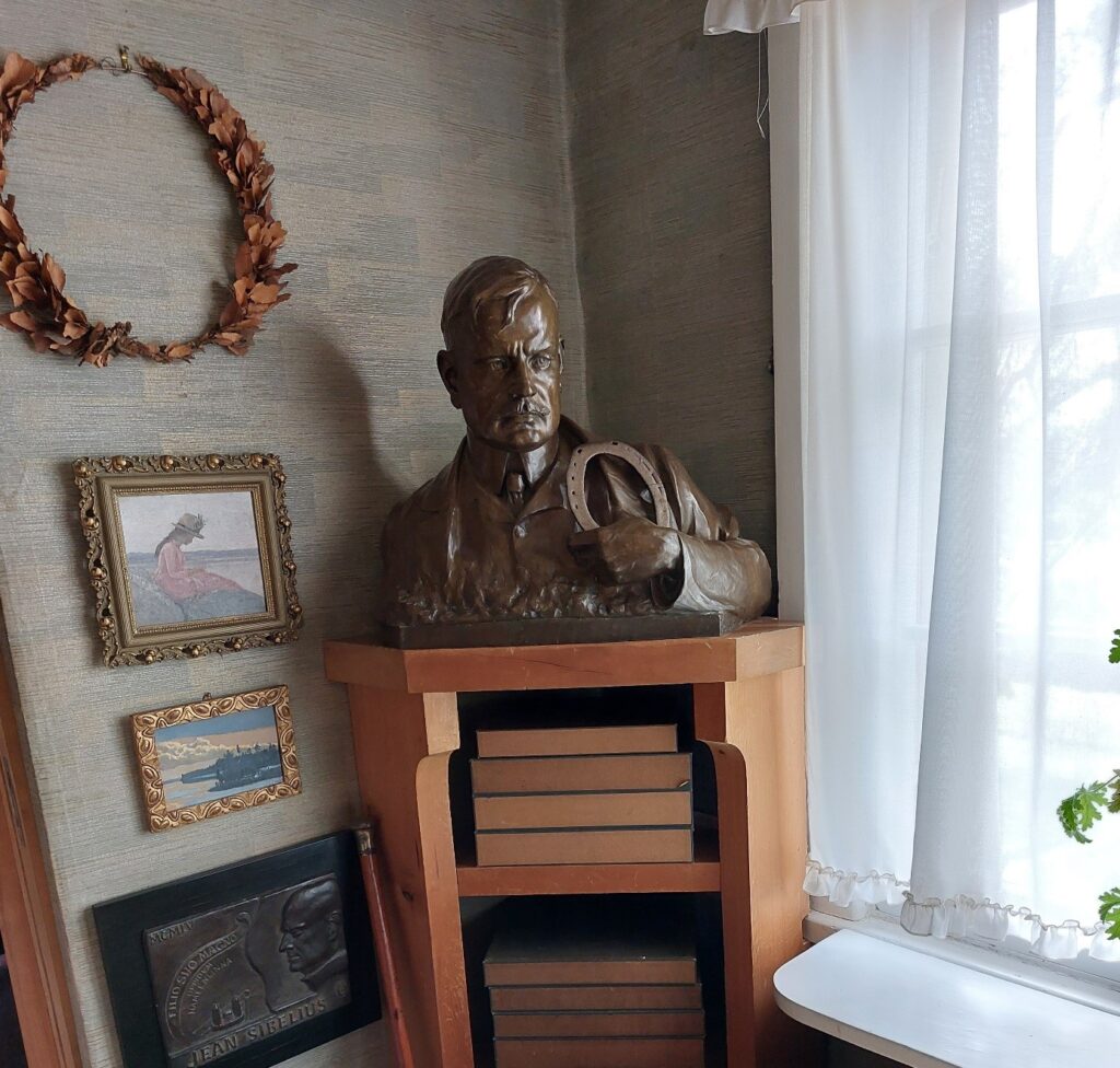 Kulmahyllyn päällä on säveltäjästä tehty rintakuva. Hän sai tuon veistoksen lahjaksi. Hänen mielestä siitä puuttui jotain, joten hän sujautti käteen hevosenkengän. Tuon pronssisen rintakuvan on valmistanut John Munsterhjelm. Tuossa hyllyssä Janne säilytti nuottejaan. Säveltäjämestari itse on suunnitellut oheisen hyllyn, josta olen tuon kuvan ottanut.