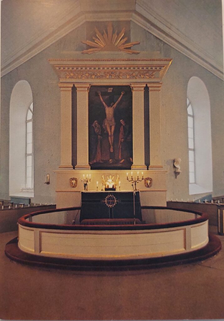 Kortissa kuvana olevan alttaritaulun on maalannut taiteilija Karl Strömbeck vuonna 1820. Jeesus ristillä on maalauksen aihe. Se on kooltaan 295 x 153 cm.