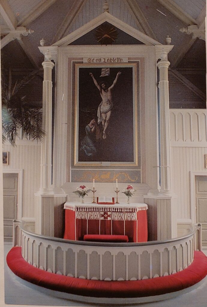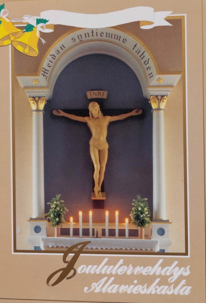 Alttaritaulun tekijä on Hugo Kähtävä. Puusta veistetty krusifiksi on tehty vuonna 1948. Postikortin on valokuvannut Ismo Hannula.