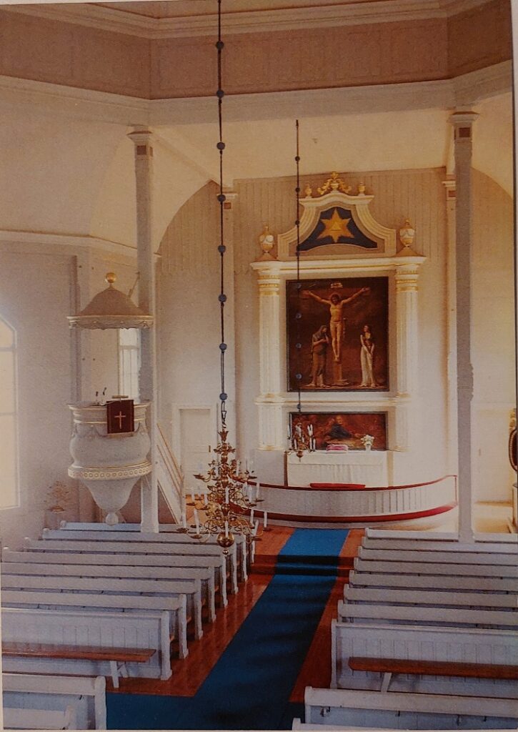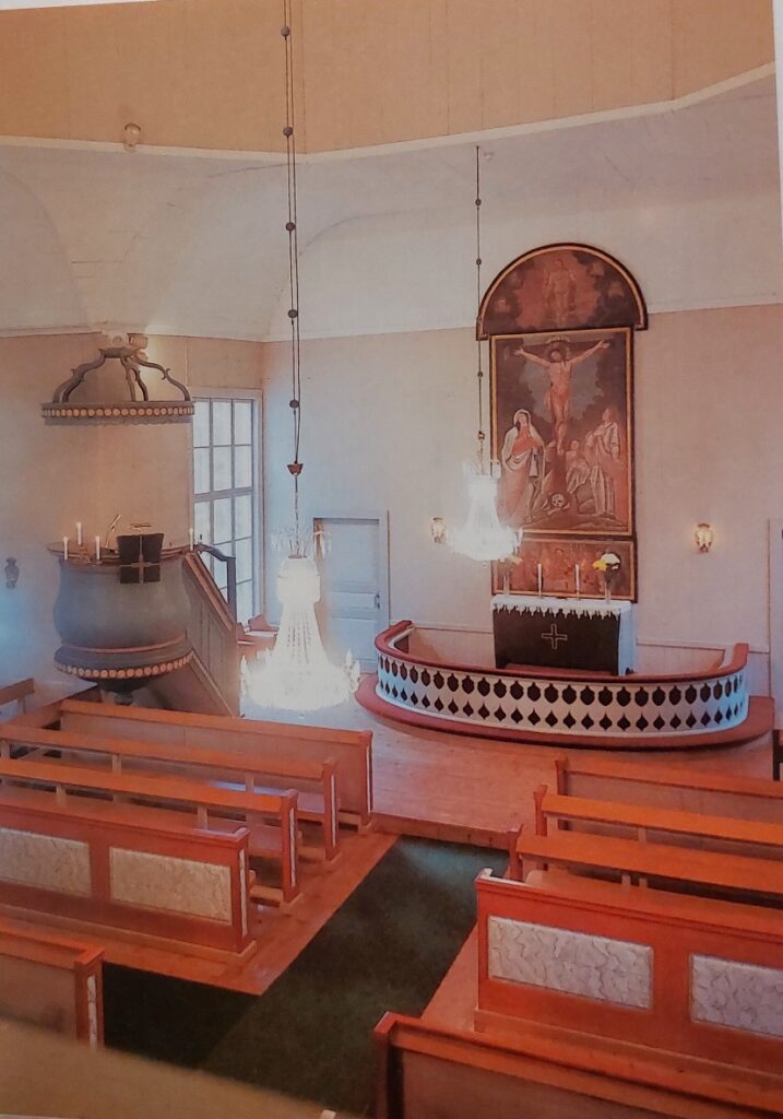 Tässä olemme Halsuan kirkon sisätiloissa. 17-vuotias Jaakko Kuorikoski rakensi isänsä Heikin suunnitelmien mukaan vuosina 1825-1826 tämän puisen ristikirkon. Alttaritaulu on kolmiosainen. Kaksi alimpaa osaa on maalannut Thomas Kiempe.