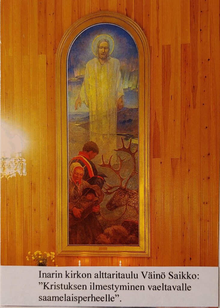Inarin saamelaiskirkko on rakennettu 1951 puusta. Arkkitehteinä ovat olleet Inkeri Visanti ja Antero Pernaja. Alttaritaulun on maalannut 1937 professori Väinö Saikko. ”Kristuksen ilmestyminen vaeltavalle saamelaisperheelle” on 260 x 86 cm öljymaalaus kankaalle.