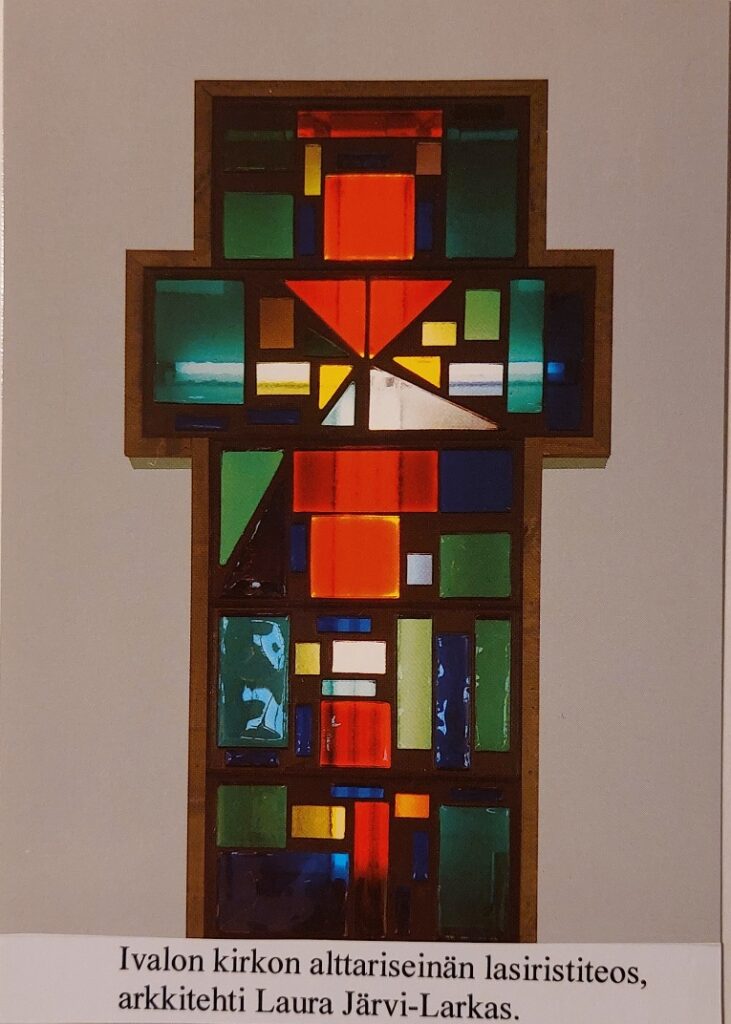 Olemme edelleen Inarissa. Tällä kertaa on kyseessä Ivalon kirkko. Sen ovat suunnitelleet Rakennushallituksen virkatyönä Kauko Kokko ja Laura Järvi-Larkas. Kirkko valmistui vuonna 1966. Alttariseinän lasiristiteoksen on suunnitellut toinen arkkitehdeistä eli Laura.