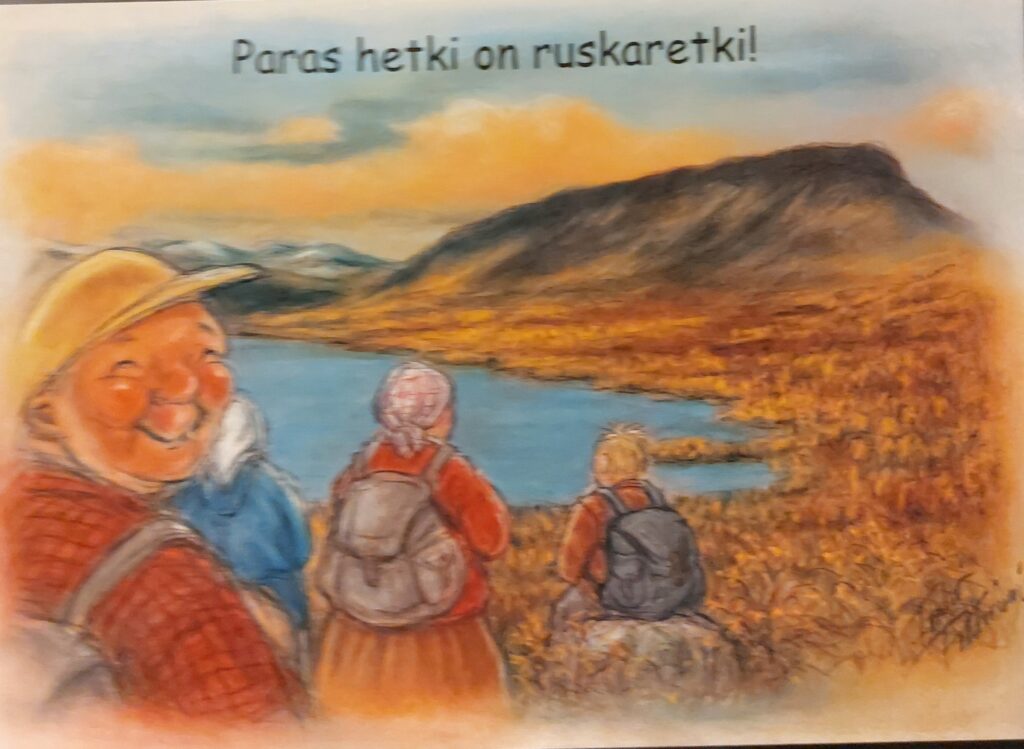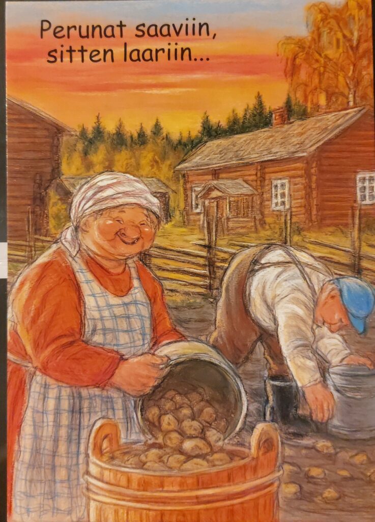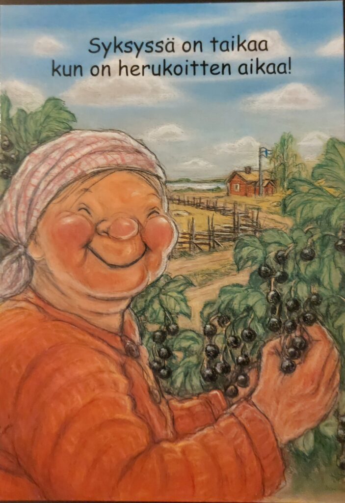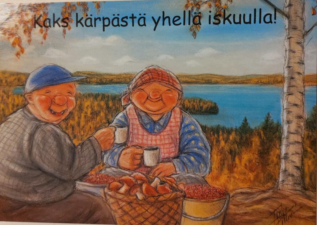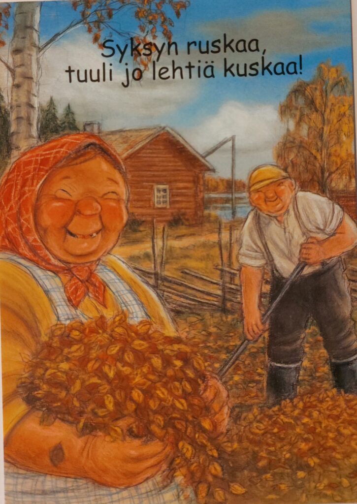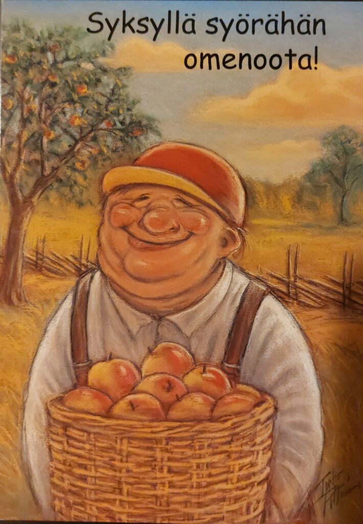 Pohjanmaan murteella on Terho Peltoniemi piirtämiään kortteja tekstittänyt. Joinakin vuosina olen itse tehnyt saamistani omenoista kylmäpuristettua mehua ja yhdistänyt siihen porkkanoita mukaan. On ollut varmasti vitamiinipitoista juomaa.